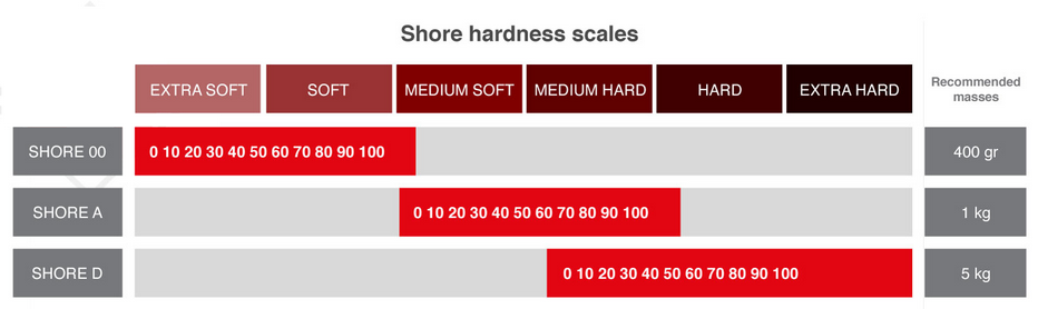 Ambas durezas tienen un rango de medición de escala Shore detectable de 0 a 100 y la penetración máxima para cada escala de dureza es de 2,54 mm. El valor Shore 0 corresponde a la ausencia de fuerza de penetración mientras que el valor Shore 100 corresponde a la máxima penetración en el material.