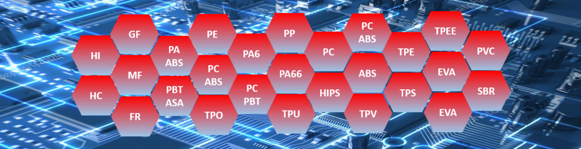 Desde polietileno hasta polipropileno, desde plásticos de ingeniería (PA, PBT, ABS, HIPS, PC/ABS etc.), hasta super-polímeros de ingeniería (PSU, LCP, PEEK etc.), desde biopolímeros hasta polímeros de segunda vida y elastómero como TPU, TPC-ET, SEBS, TPV y TPO. Sean cuales sean sus necesidades de producción, contamos con soluciones avanzadas, con una red de distribución y soporte en México, para un servicio siempre eficiente y personalizado. Compuestos para automoción, lineas de blanco, construcción, bienes industriales y bienes de consumo, electricidad y electrónica, atención sanitaria, infraestructura, embalaje, cuidado personal, transporte, compuestos para automoción y automotriz, lineas de blanco, construcción, bienes industriales y bienes de consumo.