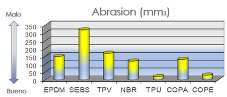 El TPU se considera uno de los polímeros elastoméricos con la mayor abrasión, en comparación con cualquier otro polímero elastomérico. Mexpolimeros ha desarrollado una masterbacth con soporte basado en TPU que aumenta la resistencia a la abrasión de cualquier TPU hasta en un 50%. En el siguiente gráfico es posible observar el valor de abrasión en función del porcentaje de masterbatch. Comenzando desde un TPU con 35 mm3 (DIN ISO 4649) de abrasión, y agregando 1% de XTHANE, la abrasión mejora en un 40% y con un 2% puede superar el 50%. Es muy importante tener el máximo efecto utilizando nuestro XTHANE LA, presionar el TPU y procesarlo de acuerdo con los buenos estándares sugeridos por el propio proveedor de TPU. A pedido, podemos suministrar maestros para reducir la abrasión de otros polímeros:- TPC-ET / TPEE