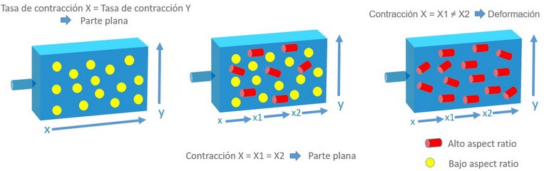 La relación de aspecto (forma) del relleno es uno de los factores clave que desempeñan un papel vital en la determinación de las propiedades de los compuestos. Los rellenos como el talco y el carbonato de calcio (CaCO 3 ) tienen diferentes relaciones de aspecto y afectan las propiedades de manera diferente. En general entre más fino el tamaño de la partícula, más altos los valores de resistencia a la tensión, módulo y dureza. Partículas más gruesas tienen a dar un compuesto con menores propiedades que el material virgen (sin carga) y por el contrario si el tamaño de partícula es más bien fino, las propiedades mecánicas mejoran, a este fenómeno se le conoce como refuerzo. Las impurezas en las cargas pueden tener efectos graves en el compuesto polimérico. Las partículas gruesas conducen a puntos de debilidad en polímeros flexibles y por tanto, pueden fallar bajo situaciones por debajo de lo esperado. En general, el fenómeno de refuerzo parece depender de tres factores: