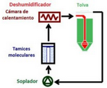 El sistema de de-humidificación se compone sustancialmente de dos partes: la tolva (o tolvas), dentro de la cual se produce el tratamiento real; l deshumidificador (secadora), que genera aire deshumidificado en cantidades y a la temperatura requerida. La tolva es esencialmente un recipiente de forma cilíndrica, equipada con un aislamiento, con el fin de reducir la dispersión de calor hacia el exterior. El material se vierte desde la parte superior y se extrajo desde el lado inferior durante el tránsito, el material es invertido por el aire caliente y deshumidificado. El tiempo necesario para atravesar la tolva (permanencia) determina la duración del tratamiento. El aire, que pasa a través del material, la resistencia es la humedad que se encuentra fuera de los gránulos es la humedad que ha migrado desde el interior hacia el exterior. El punto de rocío del aire se fija como se relaciona con aire producido por el generador de bajo ciertas condiciones secas. El generador debe proporcionar la cantidad necesaria de aire a la temperatura requerida por el tipo de pellets.