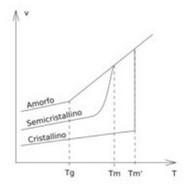 Todos los polímeros son sólidos rígidos duros a temperaturas suficientemente bajas, pero a medida que la temperatura aumenta, un polímero termoplástico eventualmente adquiere suficiente energía térmica para permitir que sus cadenas se muevan con suficiente libertad para comportarse como un líquido viscoso (suponiendo que haya sin degradación). Hay varias formas en las que un polímero puede pasar de la fase sólida a la líquida, dependiendo de la estructura de las cadenas del polímero y su disposición en la muestra. Los diferentes tipos de respuesta térmica en esta transición de un estado sólido rígido a un estado eventualmente líquido se pueden ilustrar de varias formas. Uno de los más simples y satisfactorios es rastrear el cambio en el volumen específico. En las transiciones de primer orden, como la fusión, hay una discontinuidad en la gráfica de volumen-temperatura o en la gráfica de entalpía-temperatura en la temperatura de transición. En las transiciones de segundo orden, solo se produce un cambio en la pendiente y, por lo tanto, hay un cambio marcado en la primera derivada o en los coeficientes de temperatura. La transición vítrea no es una transición de primer orden, ya que no se observan discontinuidades en Tg cuando se mide el volumen específico o la entropía del polímero en función de la temperatura.