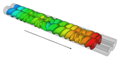 completa de las superficies. Los efectos de mezcla y amasado en la extrusora pueden alterarse organizando y seleccionando discos. Estos discos, dispuestos en una configuración escalonada, proporcionan una mezcla transversal intensiva por fuerzas de corte de intensidad variable. Dependiendo del ángulo escalonado, se pueden generar secciones de tornillo neutro, delantero o inverso. En el modo neutro, el material se transfiere de la mitad del barril a la otra mitad en forma de figura ocho antes de ser presionado para avanzar en la dirección axial por los siguientes elementos fundidos. La acción de calandrado (es decir, paso del material a través del la separación de alta velocidad de corte entre los dos discos) genera una excelente mezcla dispersiva. La introducción de elementos inversos generará una mezcla más extensa en la dirección axial. Debido a la flexibilidad de diseño y la acción de mezcla efectiva, las extrusoras de doble husillo co-rotativas se usan ampliamente en la actualidad para una multitud de aplicaciones, incluida la incorporación de rellenos y refuerzos a plásticos, concentrados aditivos, mezclas de polímeros, formulaciones de PVC y extrusión de reacción.