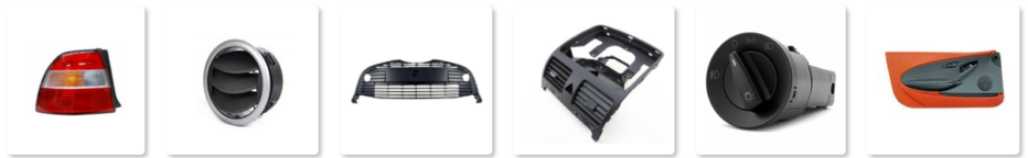 - Componentes interiores como rejillas de radiador, pilares, piezas del salpicadero, molduras de consolas centrales, piezas de asientos, componentes de puertas y carcasas de luces traseras.