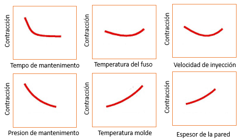 The contraction is the contraction of the molded part as it cools after the injection. Most of the contraction of the part occurs in the mold while cooling. A small amount of shrinkage occurs after ejection as the piece continues to cool. After that, the part may continue to shrink very slightly for several hours or even days, until the temperature and moisture content stabilize. Thus, dimensional inspection must wait at least one day. The contraction (shrinkage / shrinkage) is the relation between the volume of the plastic in the melt and the volume of the plastic in its final usable state. When applied to the molding, it is expressed as the relationship between the dimension of the mold and the dimension of the piece that is molded. The contraction is expressed in inches per inch or as a percentage. The contraction also varies with the thickness of the wall. Some plastics contract differently in one direction than in the other. For example, polymers filled with long glass fibers will contract more in the transverse direction than in the longitudinal direction (flow). | ![]() |