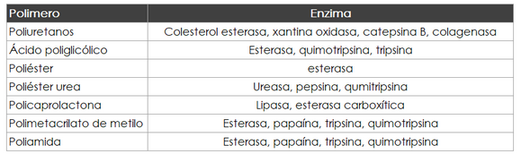 En el cuerpo humano, los materiales también pueden sufrir degradación enzimática. Esta es también una respuesta defensiva del cuerpo contra los materiales del implante y puede vincularse con la actividad celular y tisular. Aunque las enzimas se producen para interacciones específicas, son capaces de reconocer sustratos "no naturales" como los polímeros. Para interactuar con el polímero, la enzima debe difundirse en el material por hinchazón o hidrólisis. Se considera que este es el contacto primario entre la enzima y la superficie de los polímeros. En esta etapa, la enzima se vuelve inactiva, formando un complejo "enlace enzimático" al unirse a un enlace enzimáticamente susceptible (es decir, uretano, éster, etc.). Si este complejo es relativamente estable, puede producirse una escisión de enlace entre los enlaces de interfaz y la enzima unida, lo que da como resultado la formación y liberación de compuestos de bajo peso molecular. Estos compuestos luego experimentan más y escisión. Se pueden distinguir dos tipos de degradación enzimática; oxidación o hidrólisis del material en función del tipo de enzima producida. Los sistemas enzimáticos son altamente específicos y son capaces de catalizar la degradación de las cadenas de polímeros particulares.