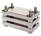 El accesorio en objeto es un accesorio de prueba del método de prueba B y consta de tres placas, con tres espaciadores entre cada par de placas. Los espaciadores conservan una deflexión fija de las probetas cuando se aprietan los cuatro pernos.