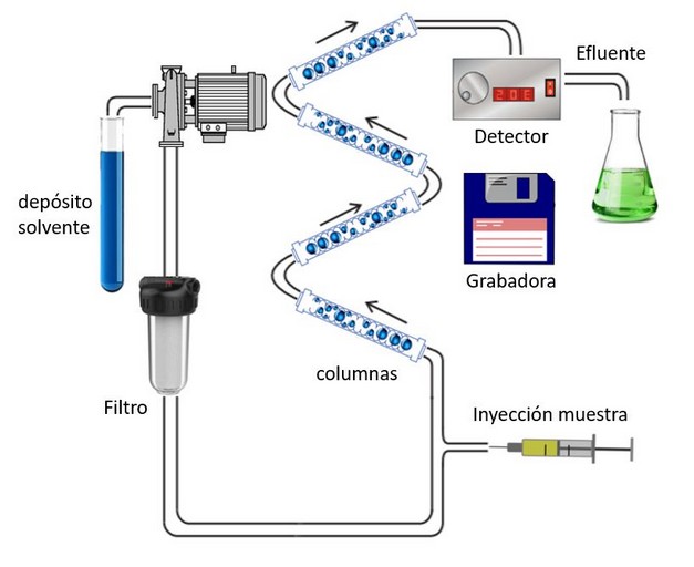 La cromatografía de permeación en gel (GPC) es un método extremadamente poderoso para determinar la distribución completa del peso molecular (MWD) y los pesos moleculares promedio. La cromatografía por permeación de gel (GPC) es una técnica analítica que separa macromoléculas disueltas por tamaño con base en su elución desde columnas llenas de un gel poroso. La cromatografía de exclusión o filtración en gel es una clase de cromatografía sólido-líquido que permite la separación de moléculas en función de su tamaño. El peso molecular de los polímeros se determina mediante GPC. La GPC (cromatografía de permeación en gel) es un método de cromatografía que mide el peso molecular y la distribución del peso molecular (Mz, Mw y Mn) comparando un polímero de muestra a patrones de poliestireno conocidos. El procedimiento utilizado es similar a la normativa ASTM D5296-05. Mz (peso molecular promedio Z) es el valor que indica la cola de alto peso molecular del polímero. Mw (peso molecular promedio en peso) indica el peso molecular promedio del 20 polímero. Mn (peso molecular promedio en número) indica el bajo peso molecular del polímero. Los tecnicos que trabajan con polímeros pueden controlar la fuerza, la resistencia y el desempeño del polímero. Esquema de Cromatografía de exclusión por tamaño (SEC) = determinación de la masa molar sobre la base de la separación por tamaño molecular :