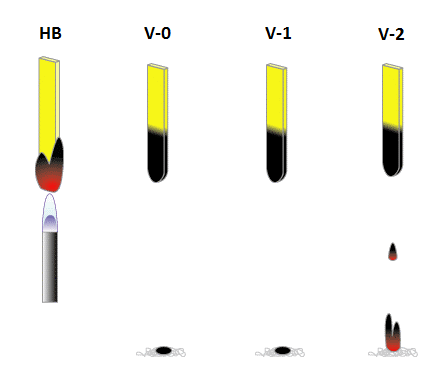 Los métodos de prueba destacados por los Laboratorios Americanos Garantes son, normalmente, los más usados para definir la capacidad de arder de un polímero plástico. Hay que especificar si el material se ha modificado con un extintor de fuego o si no posee halógenos. La primera prueba HB determina la no inflamabilidad de un polímero. Las pruebas V.0, V.1, V.2 determinan el grado de auto-extinción de un polímero.