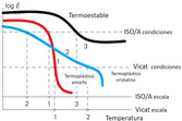 A temperaturas elevadas, todos los polímeros se ablandan, dependiendo de sus puntos de transición vidrio-caucho, Tg, y/o de sus puntos de fusión, Tm. Estas temperaturas limitan el uso práctico de los plásticos. Para caracterizar el comportamiento de ablandamiento, en la práctica se llevan a cabo varios tipos de pruebas estándar, que dan como resultado valores para la "temperatura de ablandamiento", definidos de diferentes maneras. Los valores más utilizados son: la temperatura de deflexión de calor ISO (HDT) y la temperatura de ablandamiento Vicat (VST o "Vicat"). La temperatura de reblandecimiento de Vicat es la temperatura a la que una aguja de punta plana penetra la muestra a la profundidad de 1 mm bajo una carga específica. La temperatura refleja el punto de ablandamiento cuando un material se utiliza en una aplicación de temperatura elevada. Aparentemente, el punto Vicat indica el límite donde el material, sin ser sometido a una tensión apreciable, pierde su naturaleza de estado sólido. Las temperaturas de reblandecimiento aumentan cuando hay cargas de refuerzo o fibras cortas. Tg y Tm, por supuesto, no cambiarán, pero el aumento de la rigidez hace que toda la curva E (T) cambie a un nivel superior, por ejemplo, por un factor de 2 para varios polvos (cuarzo, talco, etc.), y un factor de 3 a 5 para las fibras de vidrio. El efecto del refuerzo sobre ISO-HDT y sobre Vicat es, para los polímeros semicristalinos, mucho mayor que para los vidrios amorfos.Temperatura de ablandamiento Vicat (ASTM D 1525, ISO 306)
