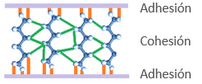La adhesión corresponde al conjunto de fuerzas o mecanismos que mantiene unido el adhesivo con el sustrato sobre el que se ha aplicado, el término de adhesión hace referencia a una fina capa (capa límite) existente entre el sustrato y el propio adhesivo.