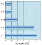 Cuanto mayor sea la proporción entre la proporción de grupos CH2 y CONH, menor será la absorción de PA 12, mejor. Aumenta la cristalinidad (normalmente entre 10% y 60%) disminuye absorción porque solo la parte amorfa absorbe el agua. El PA66 es más rígido que el PA 6 en estado condicionado debido a la menor absorción de agua, mientras que el PA 6 siempre tiene una mejor resistencia al impacto porque el agua actúa como plastificante. PA66 funciona mejor que PA6 para temperaturas superiores a 120°C. Las estabilizaciones específicas para la resistencia a la hidrólisis mejoran aún más el rendimiento del PA66.