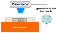 Ciertos plásticos con dipolos químicos, tales como PVC, EVA , poliuretanos y poliamidas pueden ser calentados con ondas electromagnéticas de alta frecuencia. La soldadura de alta frecuencia utiliza esta propiedad para ablandar los plásticos a unirse. El calentamiento puede ser localizado, y el proceso puede ser continuo. También conocido como sellado dieléctrico o termosellado RF (Radio Frecuencia).En la soldadura con alta frecuencia (HF) los materiales se unen utilizando la energía de un campo electromagnético (27,12 MHz) y aplicando presión sobre las superficies a soldar. La energía la produce un generador y la herramienta usada para aplicarla se denomina electrodo. La energía eléctrica hace que las moléculas del interior de los materiales empiecen a moverse, lo cual produce calor, que a su vez reblandece los materiales a soldar, que entonces se unen entre sí. | |||