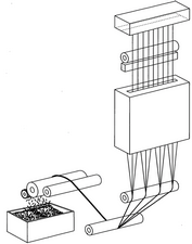 En el proceso de filamento continuo, después de que la fibra se extrae se recubre con una imprimación silano. Este apresto ayuda a proteger la fibra al enrollarse en una bobina. El apresto concreto aplicado es relativo al uso final que tenga la fibra. Mientras que algunos aprestos son coadyuvantes de la elaboración, otros hacen de la fibra tenga una afinidad por ciertas resinas, si la fibra se va a utilizar en un composite. El apresto es añadido en un 0,5-2,0% en peso. Las boquillas están diseñadas para tener un espesor mínimo a la salida. Al fluir el vidrio a través de la boquilla se forma una gota que está suspendida de la boquilla. A medida que cae, va formando un hilo, siempre y cuando la viscosidad este en el rango correcto para la formación de fibras. Los filamentos obtenidos al salir de las boquillas son enfriados al pasar por aletas de enfriamiento.