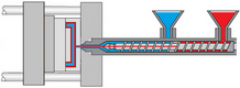 A diferencia del moldeo por inyección de varios colores o de varios componentes, el moldeo por co-inyección utiliza el mismo sistema de entrada y canal. Aquí, primero se inyecta el componente que formará la capa exterior de la pieza, seguido del componente central. Esto se logra con el uso de una máquina que tiene dos unidades de inyección separadas, controlables individualmente y un bloque común de boquillas de inyección con un cabezal de conmutación. Debido al comportamiento de flujo del polímero fundido y la solidificación del material de la piel, una capa congelada de polímero comienza a crecer desde las paredes más frías del molde. El polímero que fluye en el centro de la cavidad permanece fundido. A medida que se inyecta el material del núcleo, fluye dentro de las capas de piel congelada, empujando el material de piel fundido en el núcleo caliente hacia los extremos de la cavidad. Debido al efecto de flujo de fuente en el frente de fusión que avanza, el material de piel en el frente de fusión aparecerá en la región adyacente a las paredes del molde. Este proceso continúa hasta que la cavidad está casi llena y aparece material de piel en la superficie y el extremo de la pieza. Finalmente, se vuelve a inyectar una pequeña cantidad adicional de material de revestimiento para purgar el material del núcleo del bebedero de modo que no aparezca en la superficie de la pieza en la próxima inyección. Cuando no se inyecta suficiente material de revestimiento antes de la inyección de material del núcleo, el material de revestimiento a veces puede agotarse durante el proceso de llenado y el material del núcleo aparecerá en partes de la superficie y en el extremo de la parte que se llenó por última vez. Esto se conoce como superficie del núcleo o avance del núcleo. Existen otras variaciones del proceso de moldeo por coinyección secuencial (a saber, piel-núcleo-piel o A-B-A). En particular, se puede comenzar a inyectar el material del núcleo mientras se inyecta el material de la piel (es decir, A-AB-B-A). Es decir, la mayor parte del material de la piel se inyecta en una cavidad, seguido de una combinación de materiales de la piel y del núcleo que fluyen hacia la misma cavidad, y luego sigue el resto del material del núcleo para llenar la cavidad. Nuevamente, una pequeña cantidad adicional de inyección en la piel cerrará el final de la secuencia, como se describió anteriormente. Además de la configuración de la técnica de un canal, se han desarrollado técnicas de dos y tres canales que usan boquillas con canales de flujo concéntricos para permitir la inyección simultánea de materiales de piel y núcleo.