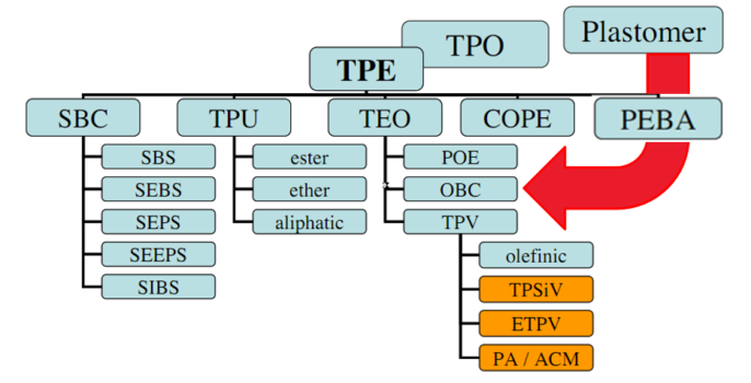 “Los polímeros, mezclas de polímeros o compuestos que, por encima de sus temperaturas de fusión, exhiben un carácter termoplástico que les permite conformarse en artículos fabricados y que, dentro de su rango de temperatura de diseño, poseen un comportamiento elastomérico sin reticulación durante la fabricación. Este proceso es reversible y el producto puede ser reprocesado y remodelado. Hay seis clases genéricas de TPE disponibles. También agregaría cloruro de polivinilo (PVC) a esta lista: